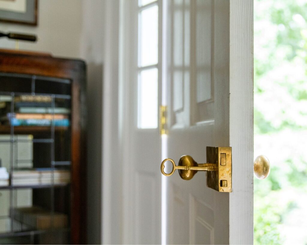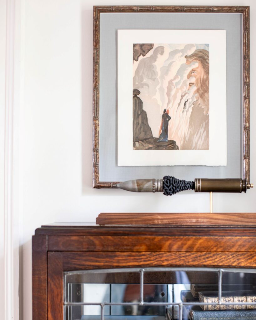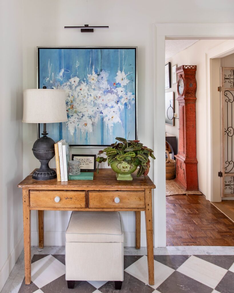 “In this small foyer, the designers blended old and new elements to create a warm and welcoming entry. A new gray and white honed marble floor, set at an angle and centered with an all-white border, contains the area, while a small antique chandelier, repurposed for the low ceiling, centers the space. On one wall, an antique cabinet sits below an original Salvador Dali woodblock; on another, an abstract painting by Atlanta artist Victoria Jackson hangs above a salvaged, rustic table. Other design elements include a sculpture presentation of a 30 mm bullet from an Apache helicopter, which the homeowners’ daughter flies for the Army. A new solid wood, six-panel front door, painted a high-gloss light green, completes the picture. ” ~ Atlanta Magazine’s Home